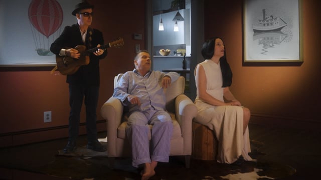Bolero is a video panorama in which viewers travel alongside a rowboat as it paddles to the marching-drum patter of Maurice Ravel’s Bolero up a broad river valley. Soloists float past in inner tubes one-by-one and are gathered into the procession. The video begins under water before tracking up to the surface, then later to the clouds and eventually into space where a trio of astronauts tinker with a warp drive.